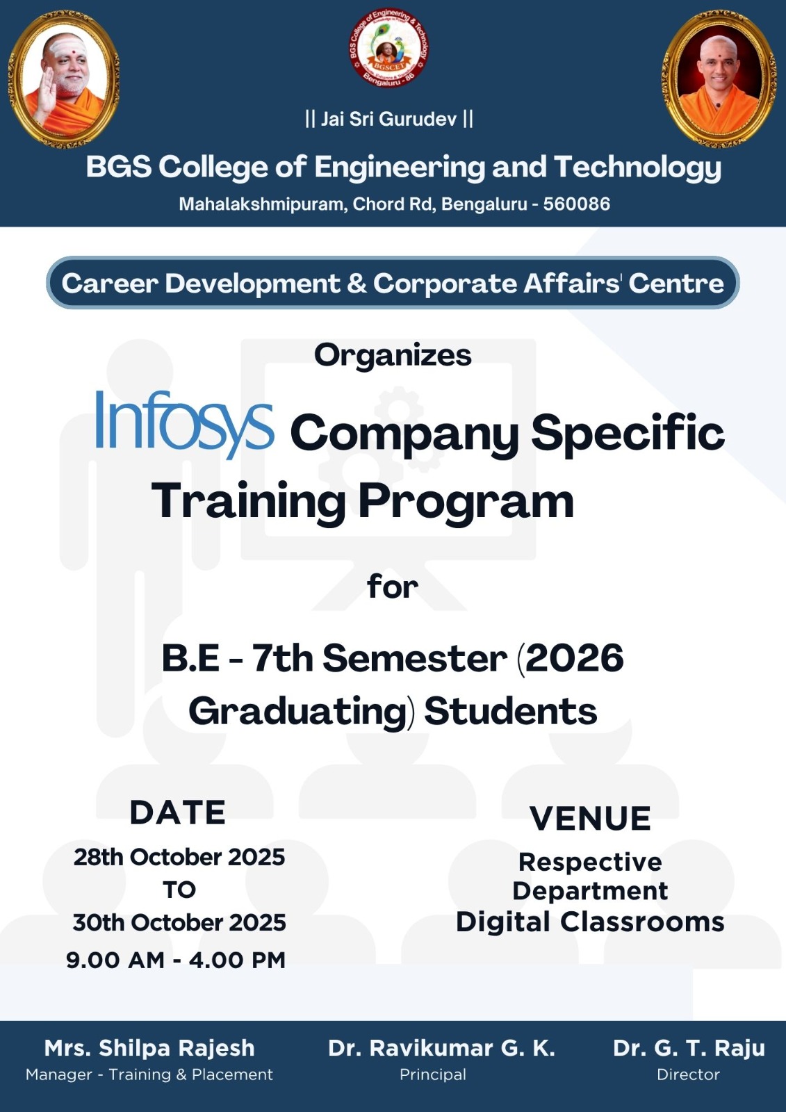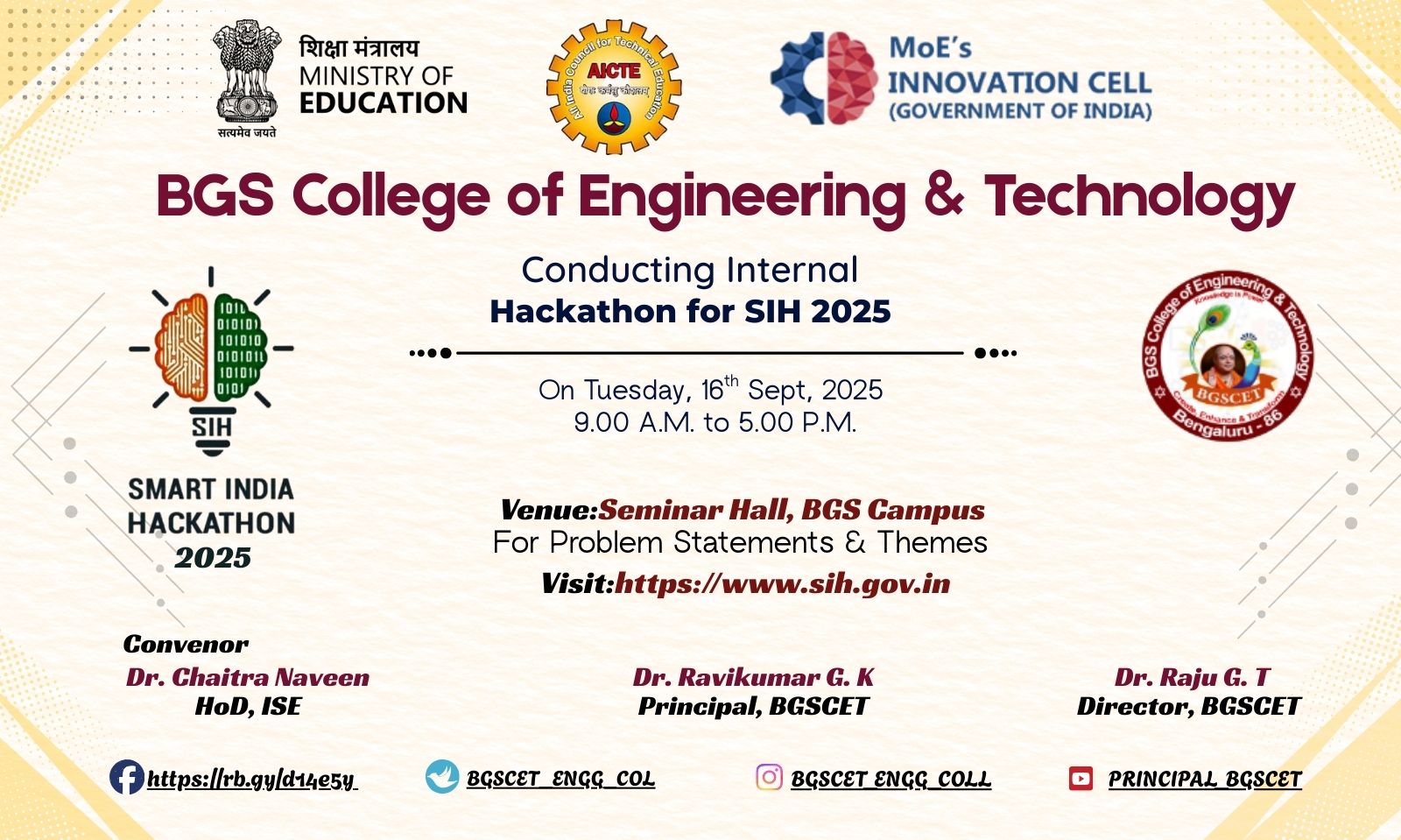 HR Conclave-May 23, 2025. World Red Cross Day-2025. Sushumna 2k25 College Magazine. Tech Talk on Cyber Security. Bizotic placement training April 1st to 7th, for 6th sem. The Grand BGSCET Hackathon-ADVAYA- April 11th & 12th. Sushumna-May 3rd & 4th.