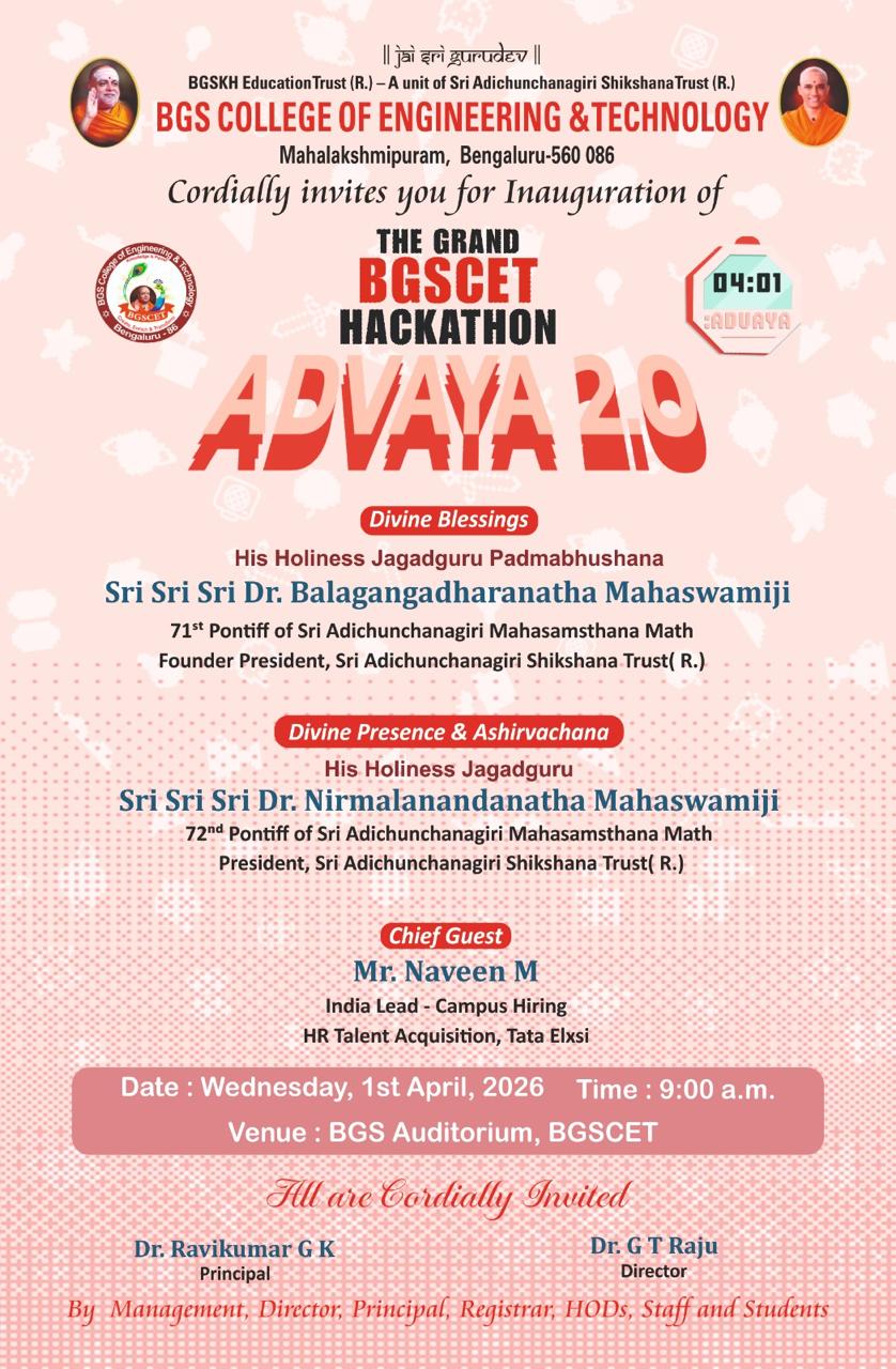 BGS College of Engineering and Technology (BGSCET), a new Engineering College with 5 market-demanding / employable / emerging (CS, IS, AI&ML, AI&DS, Design) UG courses in Engineering and Technology, established by BGSKH Education Trust(R.), A unit of Sri Adichunchanagiri Shikshana Trust(SAST) under the ambit of Sri Adichunchanagiri Mahasamsthana Mutt, a well-known philanthropic organization in Karnataka at CA Site no. 6 & 7, 3rd Main, Pipeline Road, 2nd Phase, 2nd Stage, Mahalakshmipuram, West of Chord Road, Bengaluru -560 086, Karnataka, a prime location having potential aspiring candidates from surrounding areas with good connectivity. The institute has a clear vision and objective, in the quest for being an outstanding centre for learning and development of human resource, which is conducive to the fast changing national and international situations adhering to consistent policy of recruiting highly qualified teachers.