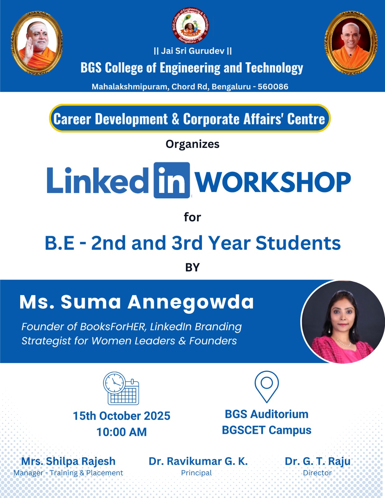 Trainings Trainings "Career Development & Corporate Affairs' Center" Read More "Progressive Training Program for B.E 5th Sem Students" Read More "One Day Orientation Session on Company Specific Information" Read More "Pre Placement Talk" Read More "Pre Placement Training Program for B.E 7th Sem Students" Read More "Orientation Program on Career Guidance and Placement Preperation" Read More "Training and Placement Activities for 6th Semester Students by BIZOTIC" Read More "Feel Employable Learning & Development Inventions" Read More "Mock Interview for 6th sem students by TATA ELXSI Ltd" Read More "Training and Placement Activities for 4th Semester Students by 10 Seconds from 10th feb 2025 to 15th feb 2025" Read More "Training and Placement activities for 3rd sem by 10 Seconds from 2nd September 2024 to 6th September 2024" Read More