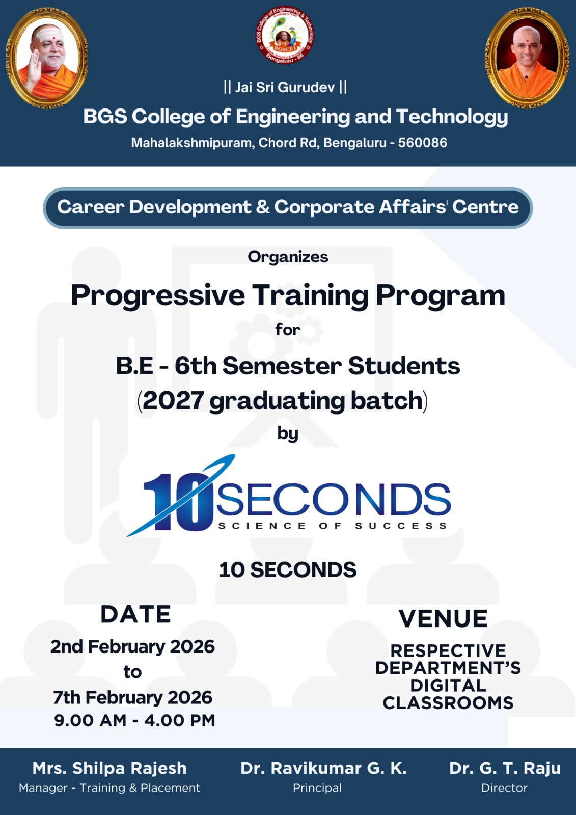 Progressive Training Program (Competency Enhancement Program) Progressive Training Program (Competency Enhancement Program) "Progressive Training Program for B.E 6th Sem Students" Read More "BIZOTIC" Read More "INFOSYS" Read More "Career Development & Corporate Affairs' Center" Read More "One Day Orientation Session on Company Specific Information" Read More "Progressive Training Program for B.E 5th Sem Students" Read More "Pre Placement Talk" Read More "Orientation Program on Career Guidance and Placement Preperation" Read More "Pre Placement Training Program for B.E 7th Sem Students" Read More "Training and Placement Activities for 6th Semester Students by BIZOTIC" Read More "Mock Interview for 6th sem students by TATA ELXSI Ltd" Read More "Feel Employable Learning & Development Inventions" Read More "Training and Placement Activities for 4th Semester Students by 10 Seconds from 10th feb 2025 to 15th feb 2025" Read More "Training and Placement activities for 3rd sem by 10 Seconds from 2nd September 2024 to 6th September 2024" Read More
